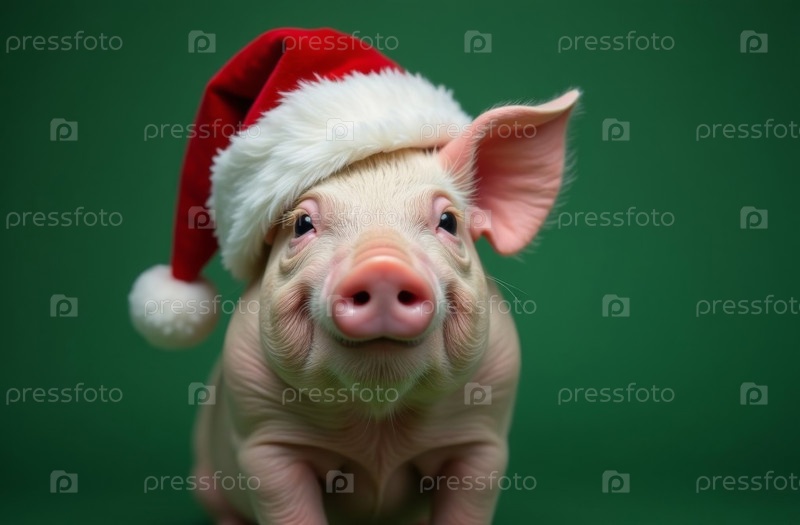 Новогодний портрет свиньи в шляпе Санты на зеленой, рождественской открытке искусственно созданной