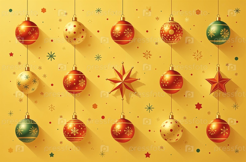 Новогодние открытки, рождественские шары и снежинки на цветном фоне
