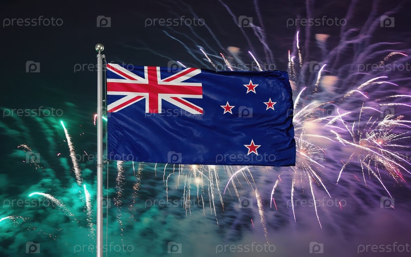 AI генеративный Флаг национальной независимости Новой Зеландии, фейерверк на заднем плане
