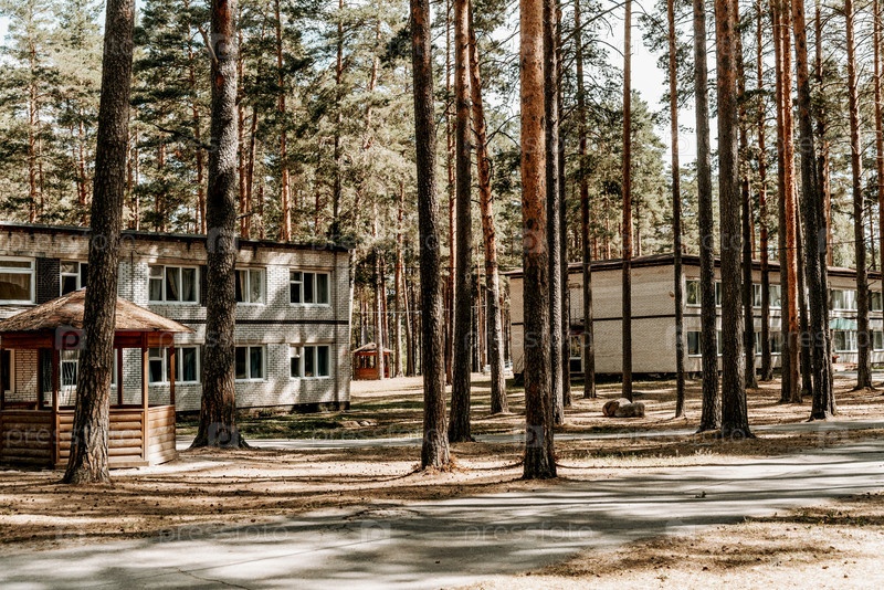 Старые кирпичные здания советского пионерского лагеря в пустынном сосновом лесу парка