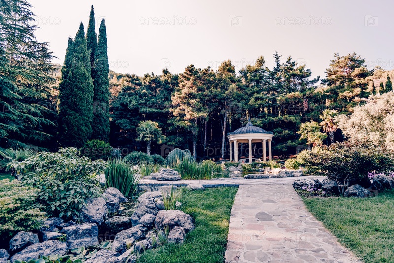 Пейзаж Айвазовского парка с деревьями, травой и летними тропами Партенит, Крым