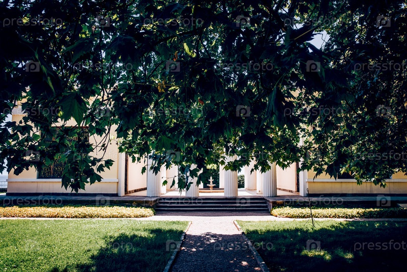 Панорама пейзажа Воронцовского парка с деревьями, травой, лужайкой и тропами в солнечный летний день, Алупка, Крым
