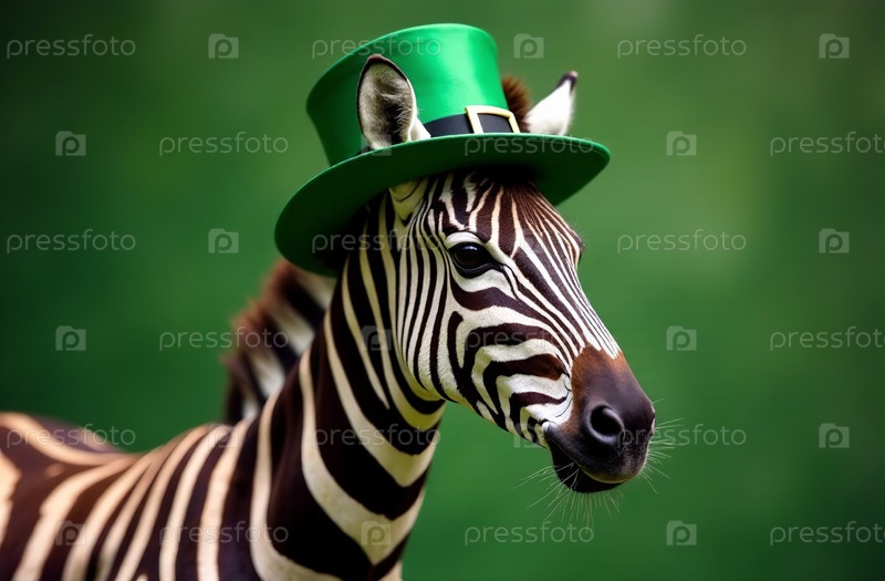 ИИ генеративная животная зебра в традиционном зеленом костюме ирландской шляпы, открытка на День Святого Патрика