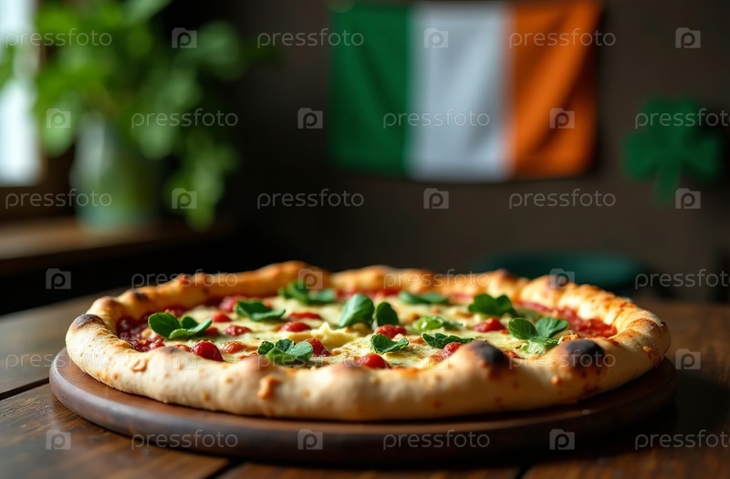 Ирландская пицца на деревянном столе, украшенной ко Дню Святого Патрика