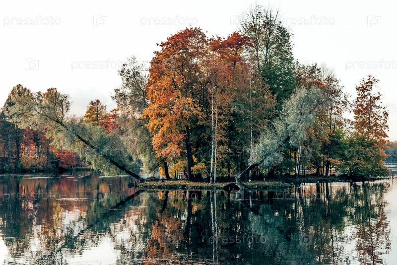 Панорамный пейзаж Гатчинского дворцового парка с деревьями, травой, газоном и тропами