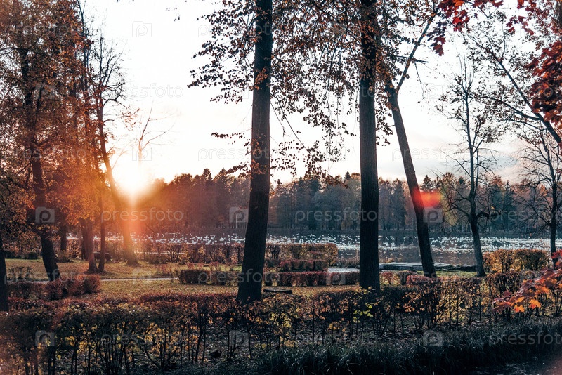 Панорама пейзажа Гатчинского дворцового парка с деревьями, травой, газоном и тропами в осенний пасмурный день