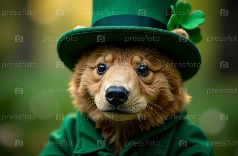 Медведь в традиционном зеленом ирландском костюме с шляпой, открытка на День Святого Патрика