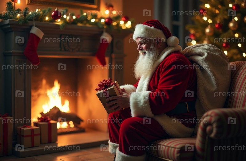 Созданный искусственным интеллектом Санта-Клаус сидит и отдыхает в кресле дома, украшенная рождественская елка с подарками на заднем плане, холодная зима и снег за окном