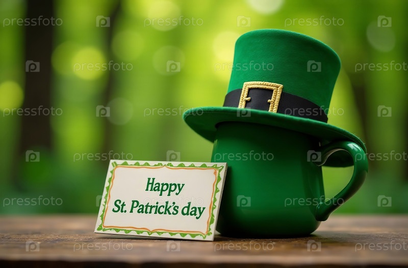 Карта Дня Святого Патрика, опирающаяся на ирландскую шляпу на зеленом фоне
