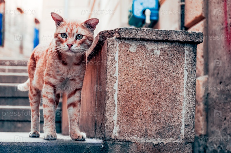 Бездомный пушистый питомец смешной кот на улицах старого города в Баку, Азербайджан