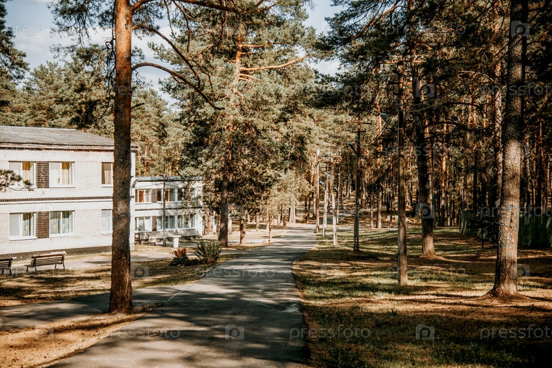 Старые кирпичные здания Советский пионерский лагерь на территории пустынного парка соснового леса