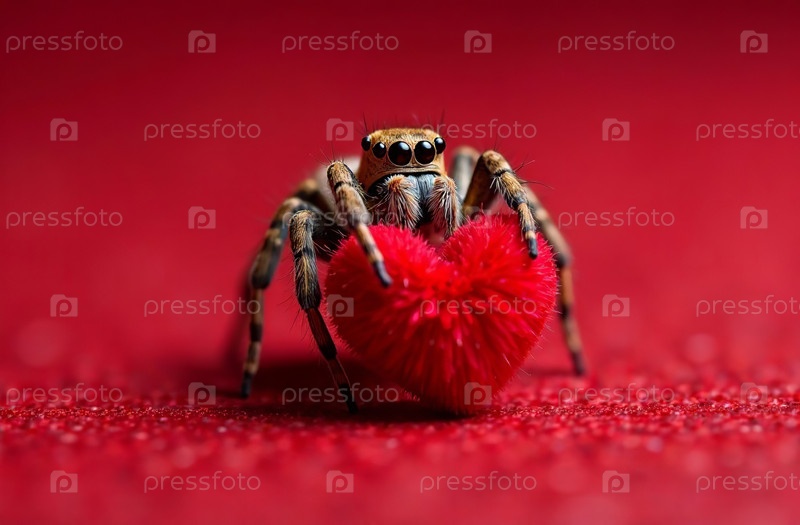 Карта дня святого Валентина, паук с пушистым красным фоном сердца. генеративный ИИ