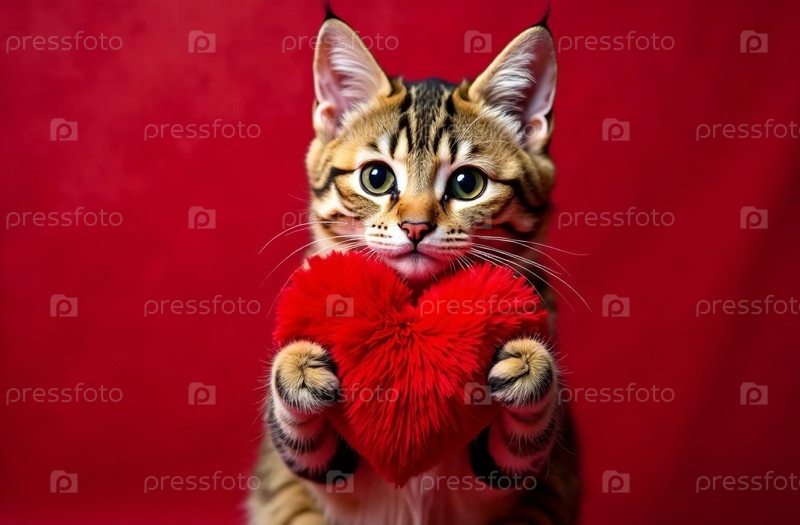 Карточка на День Святого Валентина, кот с пушистым красным фоном сердца