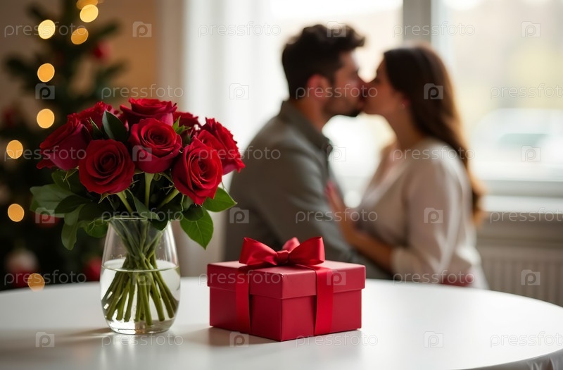AI Generative Valentine's Day представляет красную коробку с букетом роз в вазе на столе. пару поцелуев на заднем плане