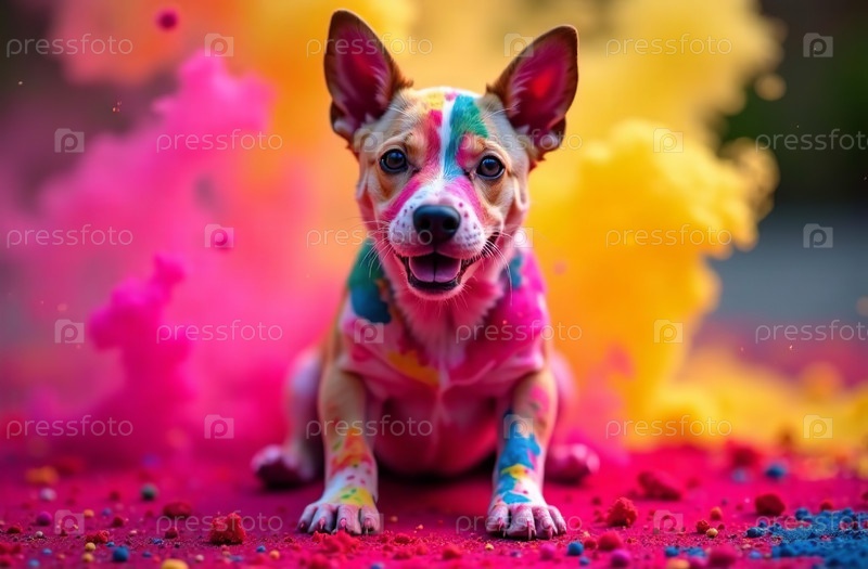 Щенок животного распылял цветные краски на Холи, индийский весенний фестиваль