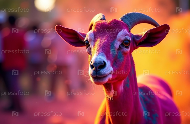 Животное козло распылялось красочными красками Холи, индийского весеннего фестиваля