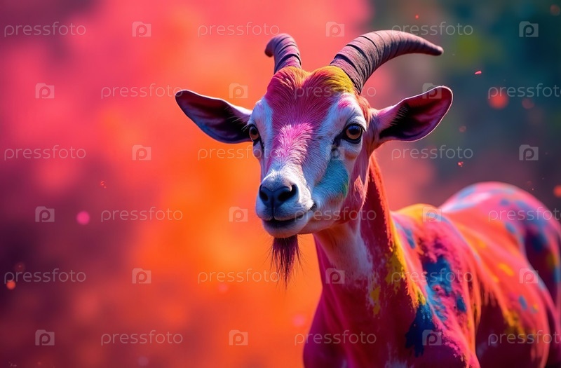 Животное козло распылялось красочными красками Холи, индийского весеннего фестиваля
