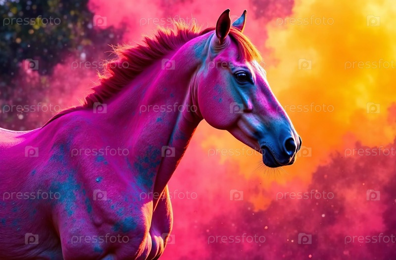 Животный конь распылял красочные краски на Холи, индийский весенний фестиваль
