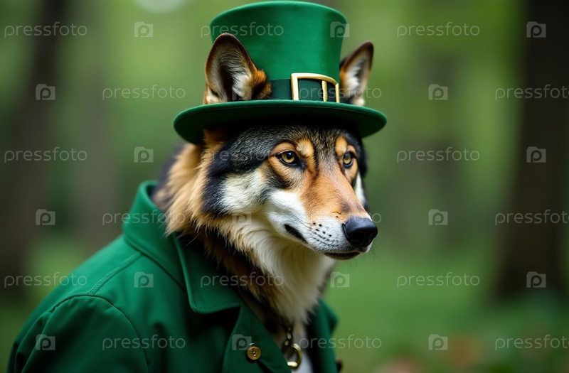 Искусственный волк в традиционном зеленом ирландском костюме с шляпой, открытка на День Святого Патрика