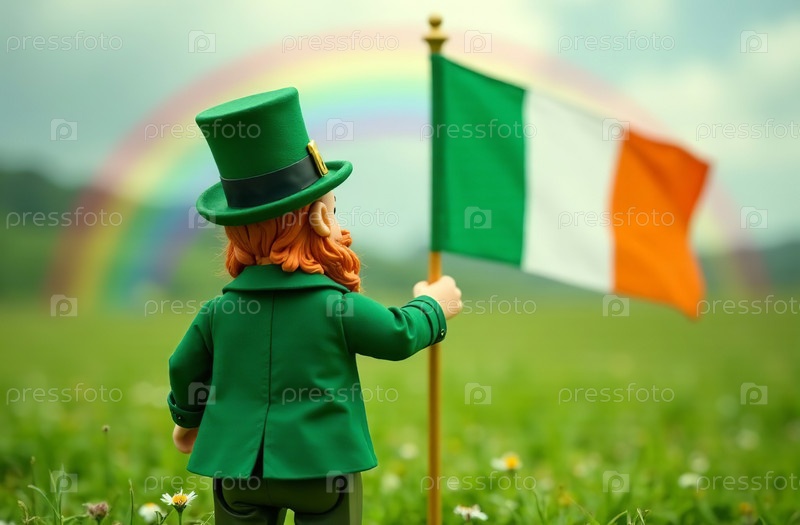 Открытка на День Святого Патрика, Золото из кастрюли, Шляпа, Лепрехаун, Флаг Ирландии
