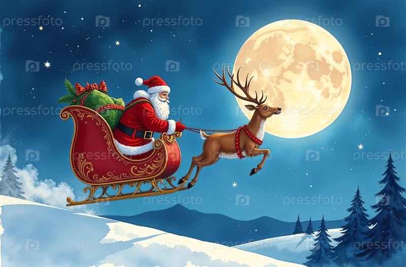 Санта-Клаус летает на лесном оленя санях, рождественская ночь луна. искусственно создан