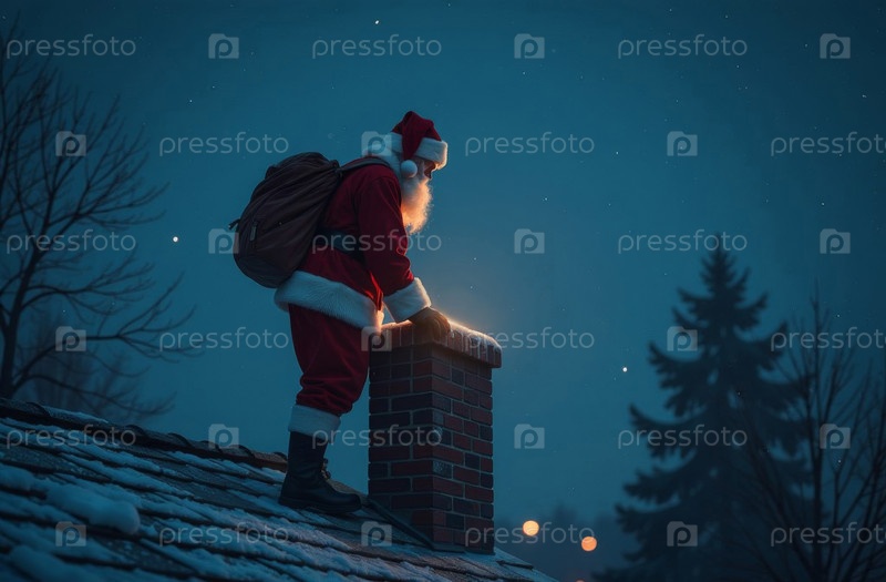 Санта Клаус поднимается на крышу дымового камина, Рождественская ночь
