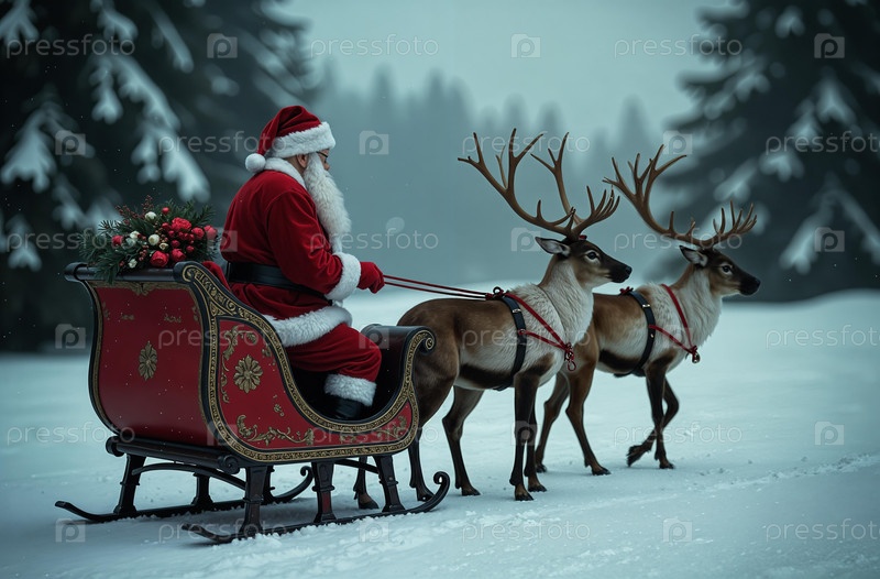 Созданный ИИ Санта-Клаус едет на санях с оленями через снежный лес, яркий пасмурный рождественский день