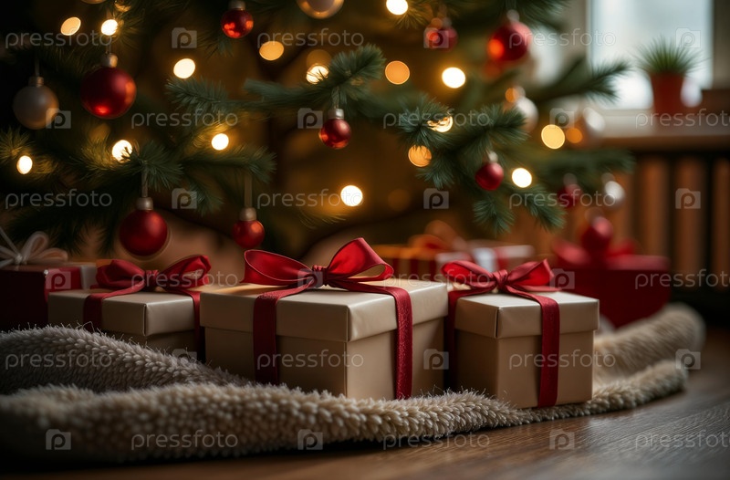 Новогодние подарки лежат на полу рождественская елка, упакованные коробки, текстовый пробел. искусственно создан