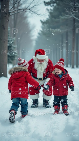 Созданный ИИ Санта-Клаус играет с детьми в снегу на открытом воздухе, снежный лес днем, идёт снег