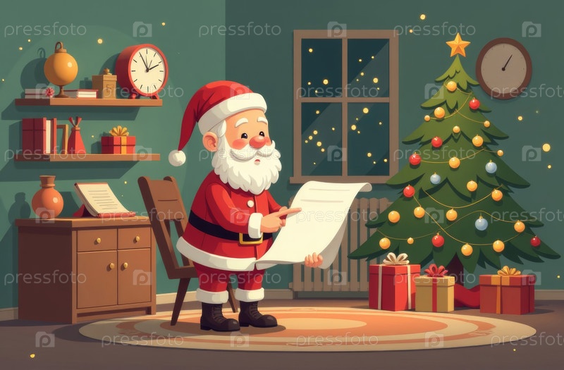Созданный ИИ Санта-Клаус в украшенном доме готовится к Новому году, на заднем плане рождественская елка с подарками, снаружи снежной зимней ночью