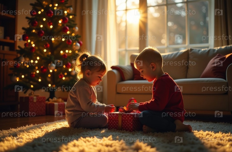 Созданный искусственным интеллектом мальчик и девочка открывают новогодние подарки в украшенной гостиной, брат и сестра сидят на ковре с рождественской елкой на заднем плане