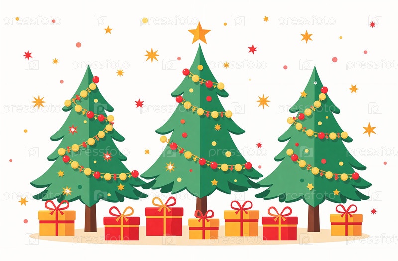 Созданная искусственным интеллектом, украшенная рождественская елка с упакованными подарками стоит в лесу под снегом, на новогоднюю ночь праздничные открытки