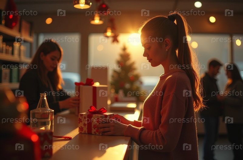 Созданная искусственным интеллектом женщина покупает новогодний подарок в магазине, рождественские покупки на ярмарке