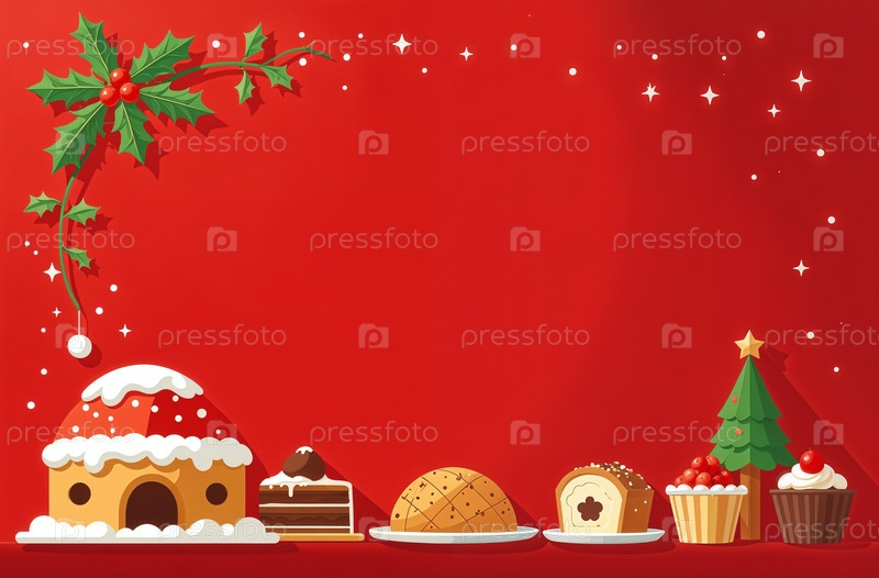 Созданная искусственным интеллектом рождественская выпечка, лежащая на красном столе, Новый год украшенный ледяными пирогами и тортами, открытка с пространством для текста