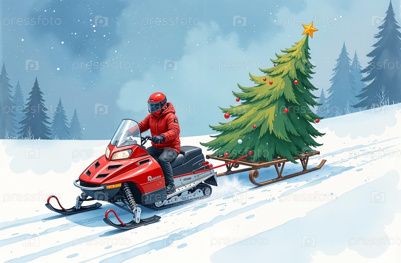 Человек едет на снегоходе и несет снежный зимний лес на дереве