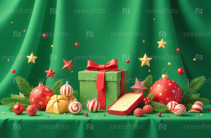 Искусственно созданный натюрморт с подарками, новогодние игрушки и рождественская елка стоит на столе, зеленые драпировки