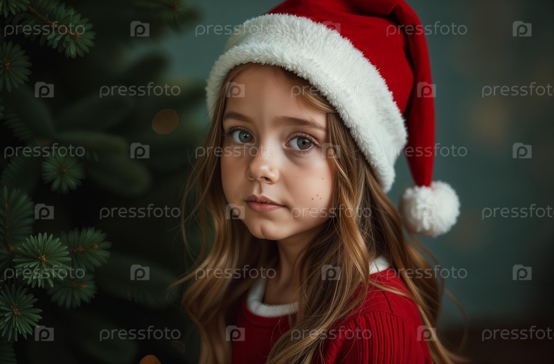 Портрет девочки Санта-Клауса в костюмированной шляпе, детская улыбка, место для текста. искусственно создан
