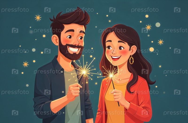 Мужчина и женщина улыбаются и держат искры, рождественскую открытку