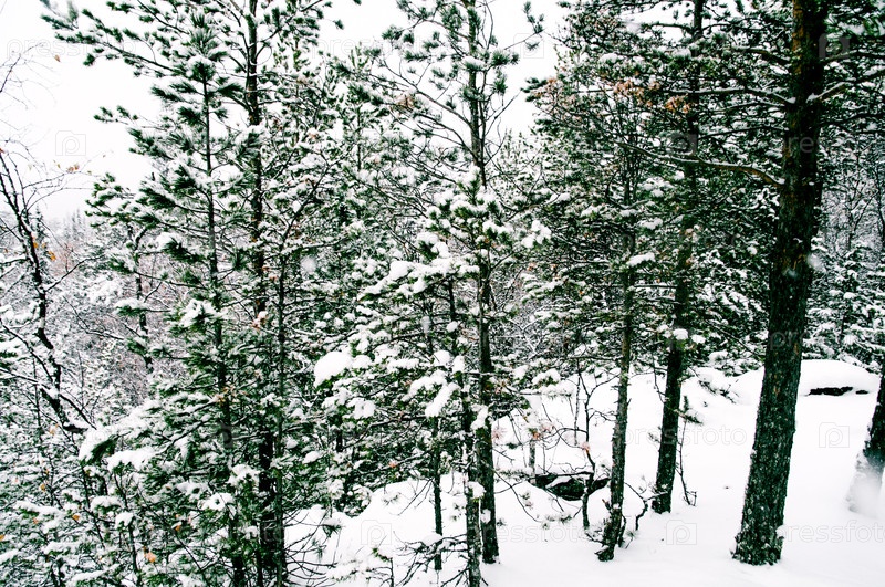 Зимний лесный пейзаж, снежные деревья небо, яркий облачный день