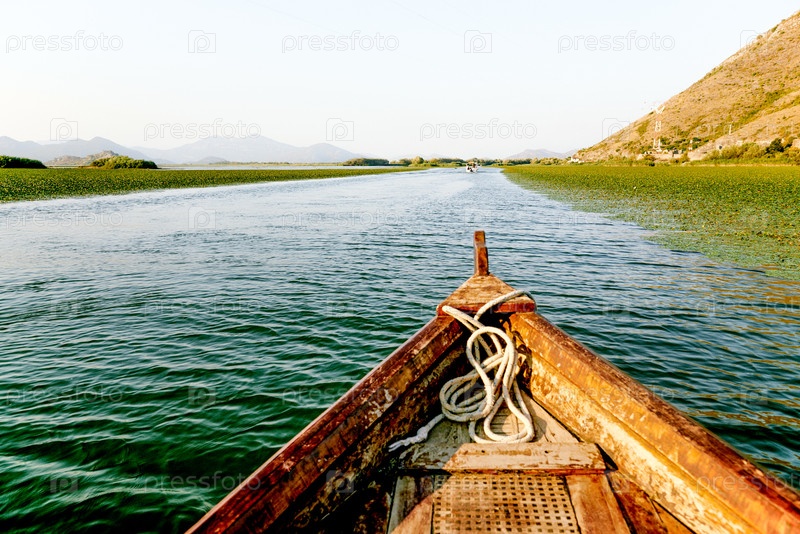 Деревянная лодка на воде озера Скадар в Черногории, летний пейзаж