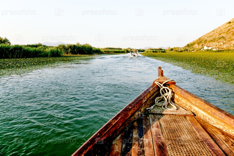 Деревянная яхта, плавающая на воде озера Скадар в Черногории, летний пейзаж в солнечный день