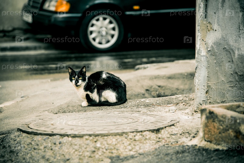 Бездомный пушистый волосатый смешной домашний кот гуляет по улицам крымского города