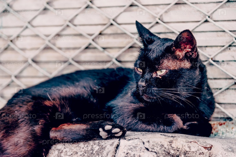 Бездомный пушистый волосатый смешной питомец кот лежит на плоской поверхности и оглядывается