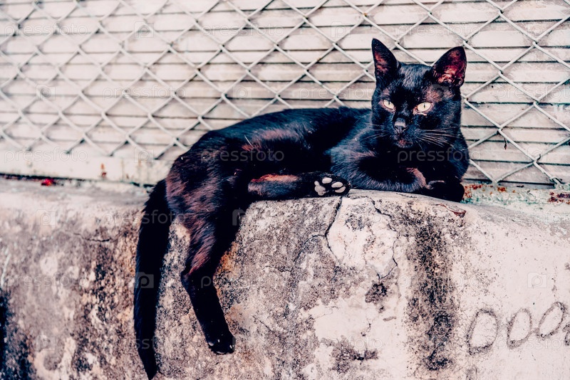 Бездомный пушистый волосатый смешной питомец кот лежит на плоской поверхности и оглядывается
