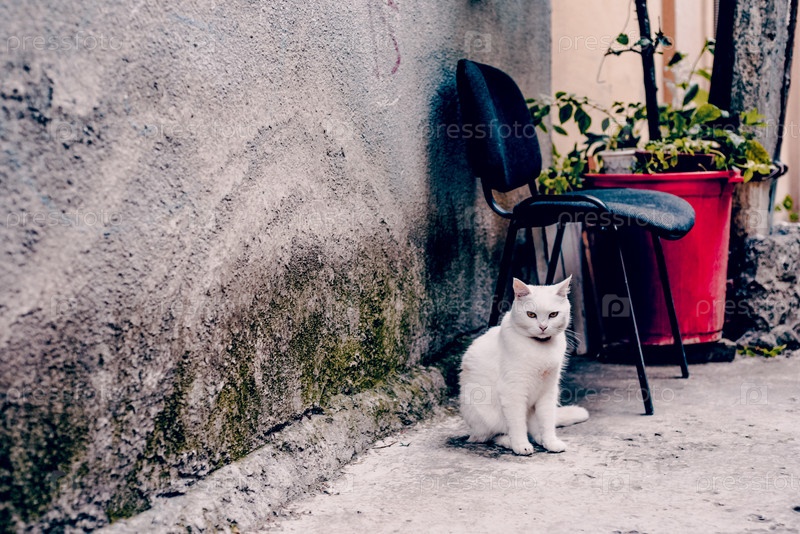 Бездомный пушистый волосатый смешной домашний кот гуляет по улицам крымского города