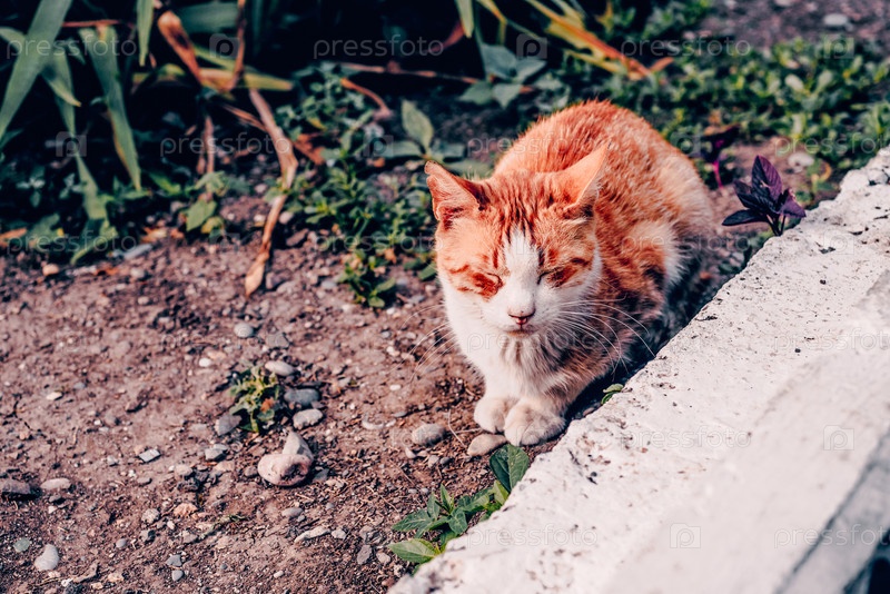 Бездомный пушистый волосатый смешной питомец кот лежит на плоской поверхности и оглядывается
