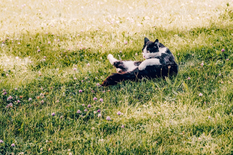 Бездомный пушистый пушистый смешной питомец кошка лижет себя, лежа на траве