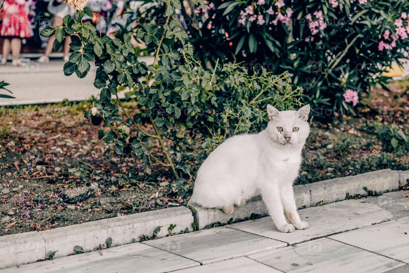 Бездомный пушистый волосатый смешной домашний кот гуляет по улицам крымского города