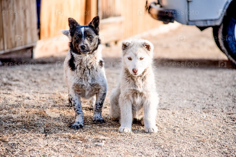 Два милых щенка бездомной пушистой собаки сидят на полу снаружи