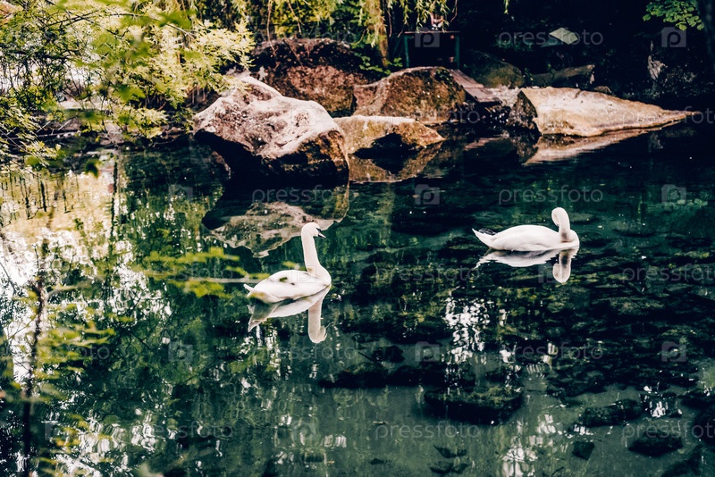 Пара белых лебедей плавает в небольшом озерном пруду в парке Айвазовский Партенит, Крым